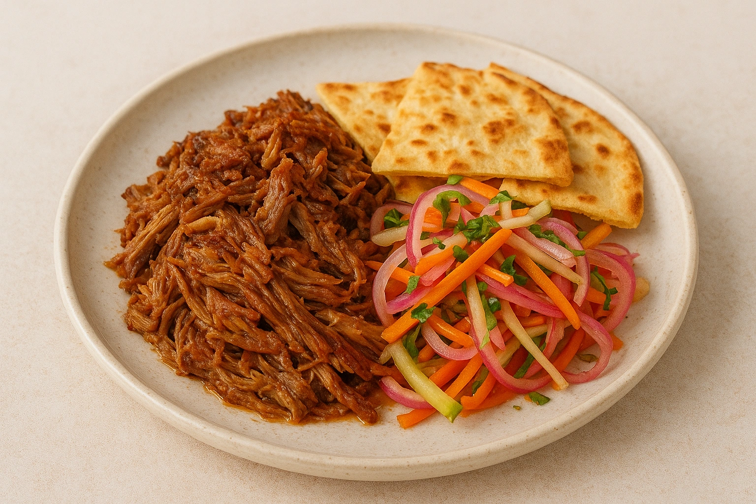 Pulled pork with soused vegetables and flatbread crisps