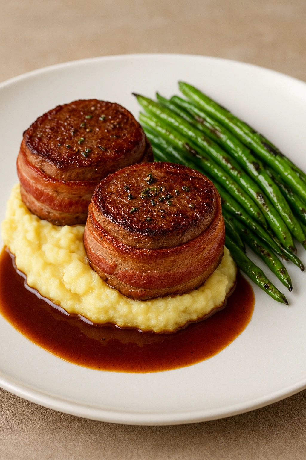 Mini Beef Mignons with roasted garlic mash, grilled green beans and jus